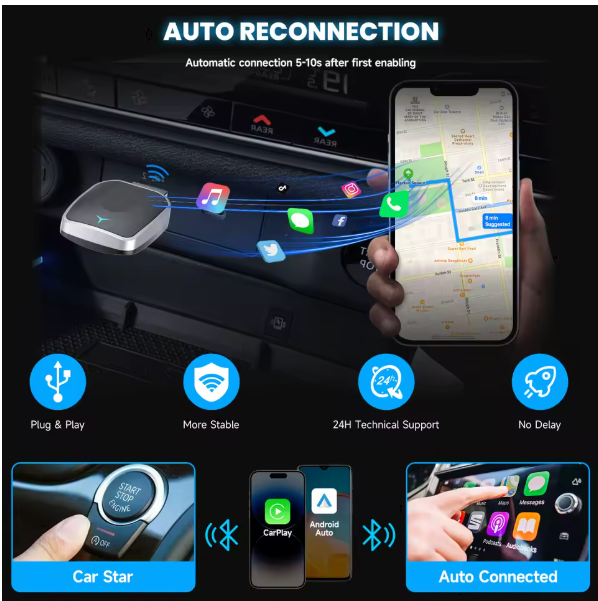 Compact and easy to install, this wireless adapter offers a smooth, responsive connection every time you start your car—making every drive more convenient, modern, and enjoyable.