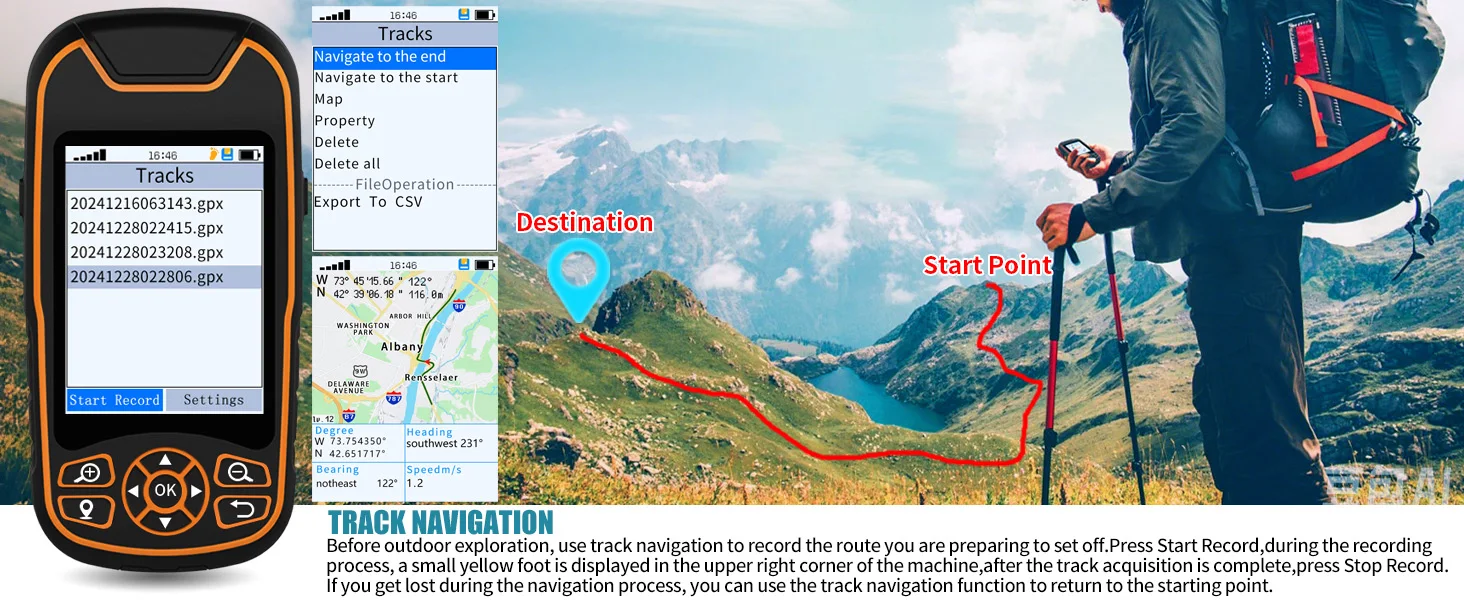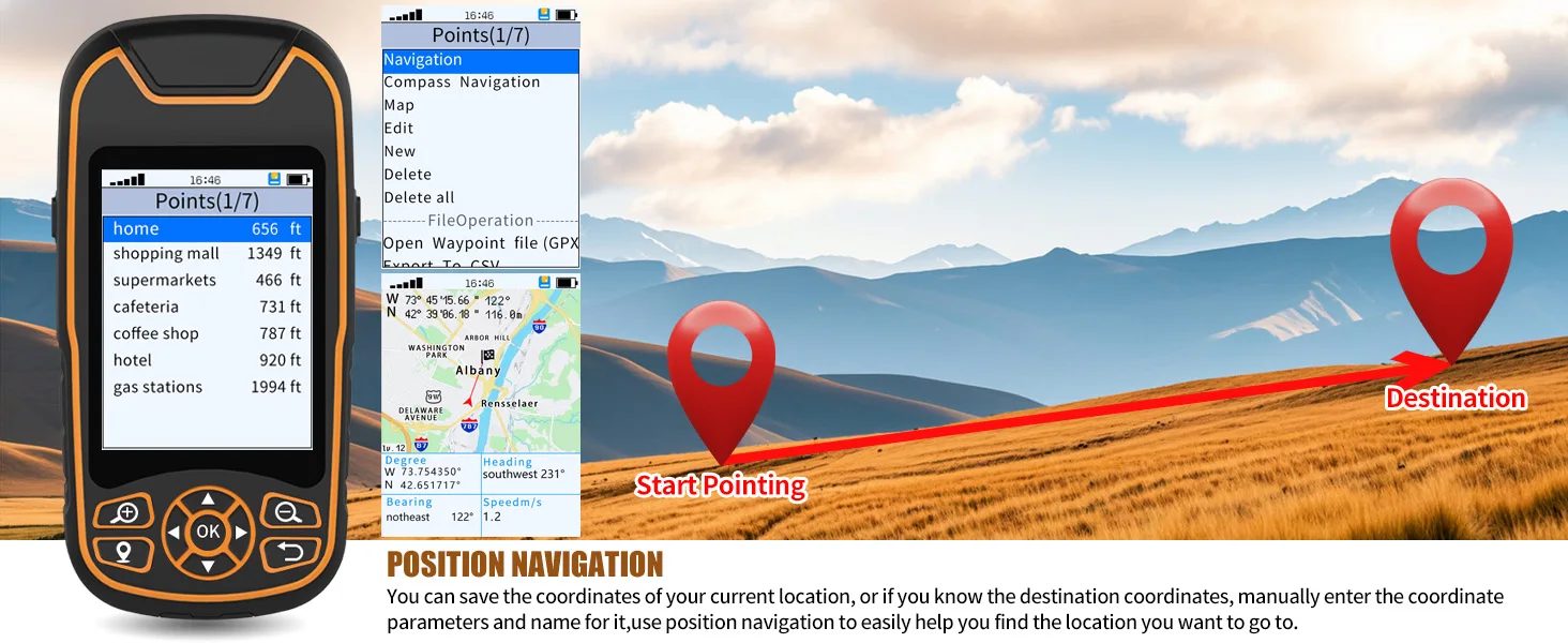 The handheld GPS navigator uses GPS technology to capture your trip or waypoint so you can guide back to your starting position