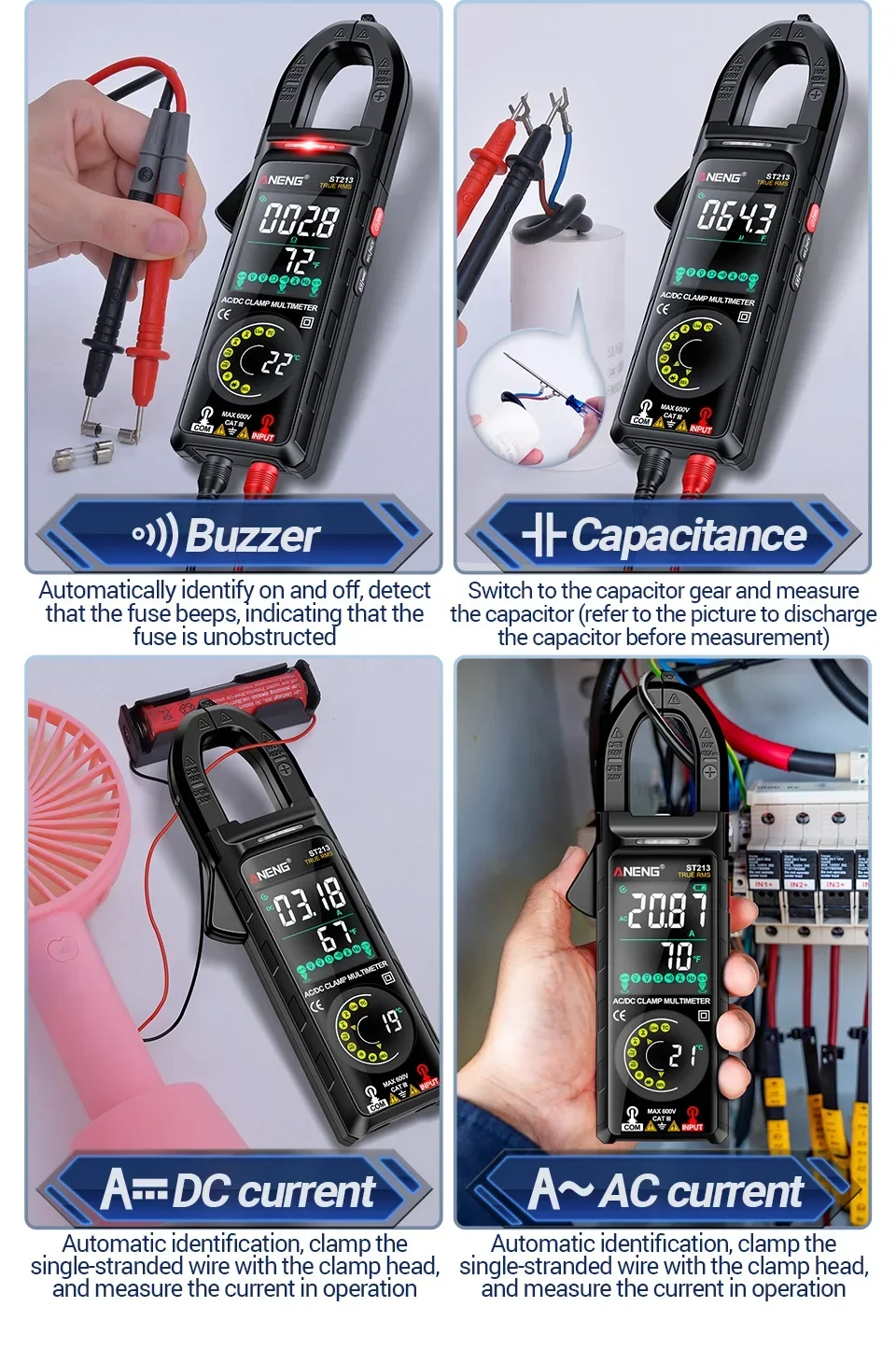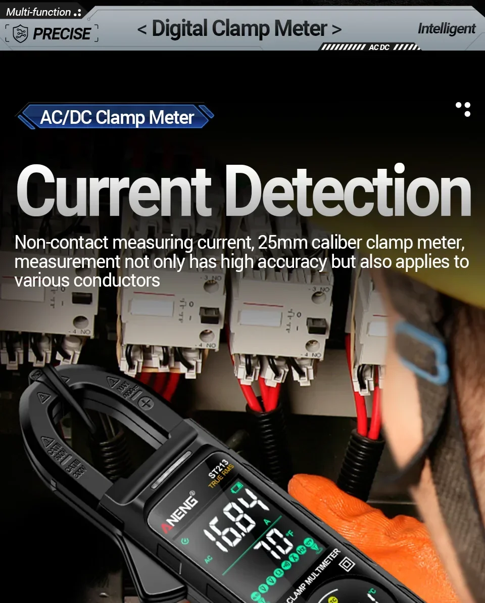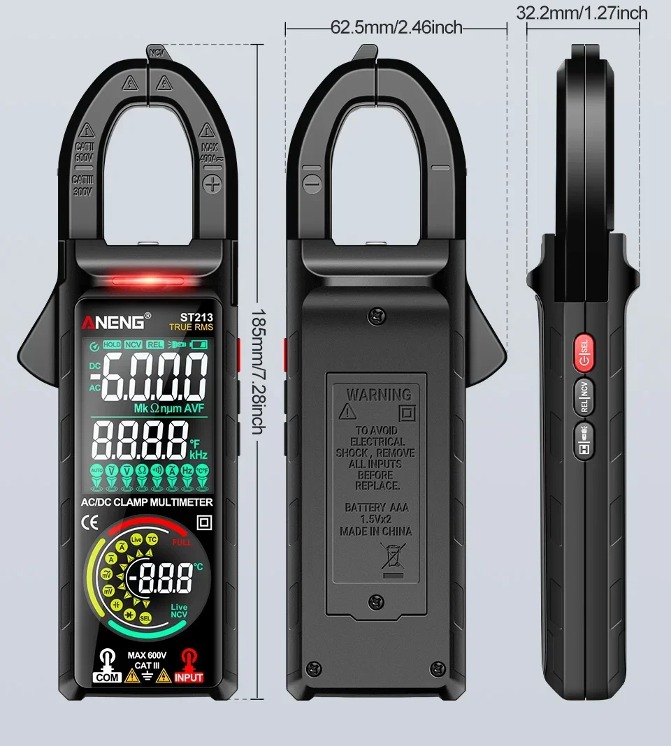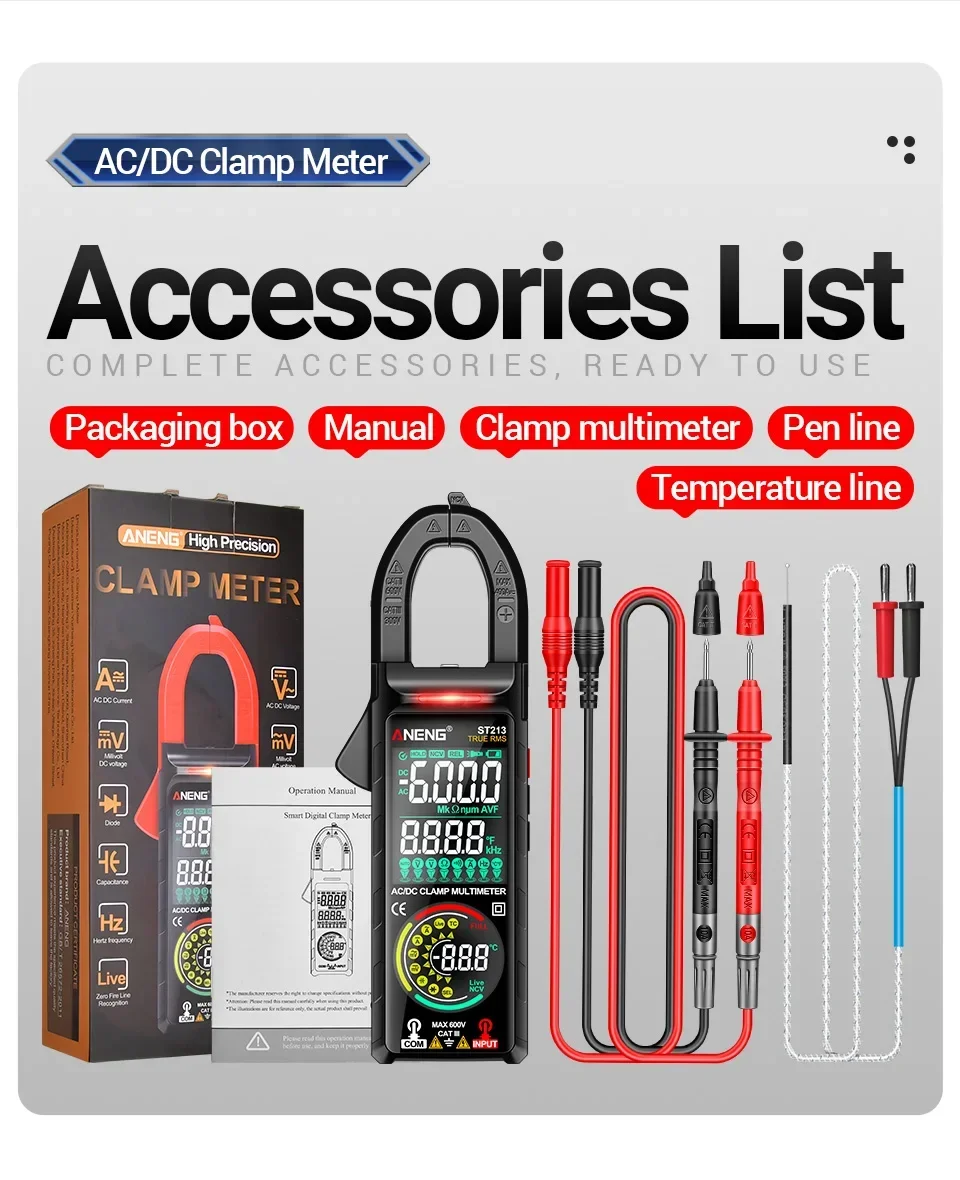 Aneng ST213 Smart Clamp Multimeter 6000 Count DC/AC Voltage Current Resistance Capacitance Hz Temperature NCV Buzzer Test