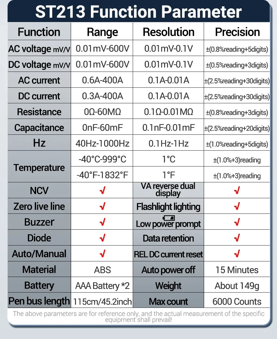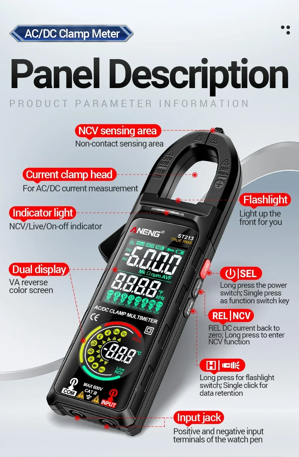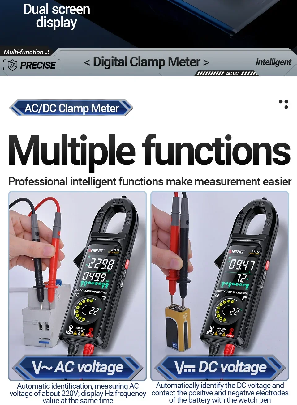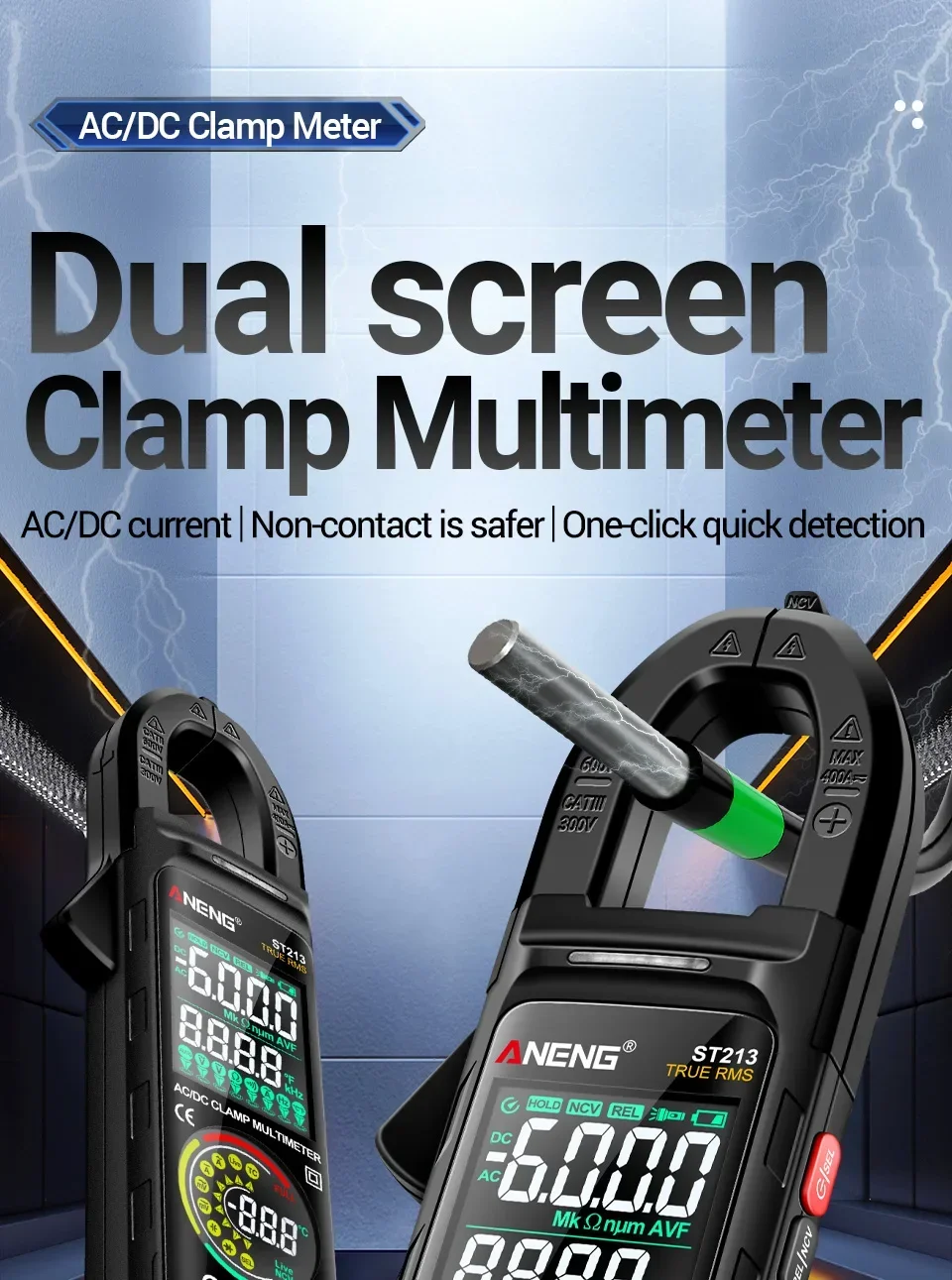 Aneng ST213 Smart Clamp Multimeter 6000 Count DC/AC Voltage Current Resistance Capacitance Hz Temperature NCV Buzzer Test