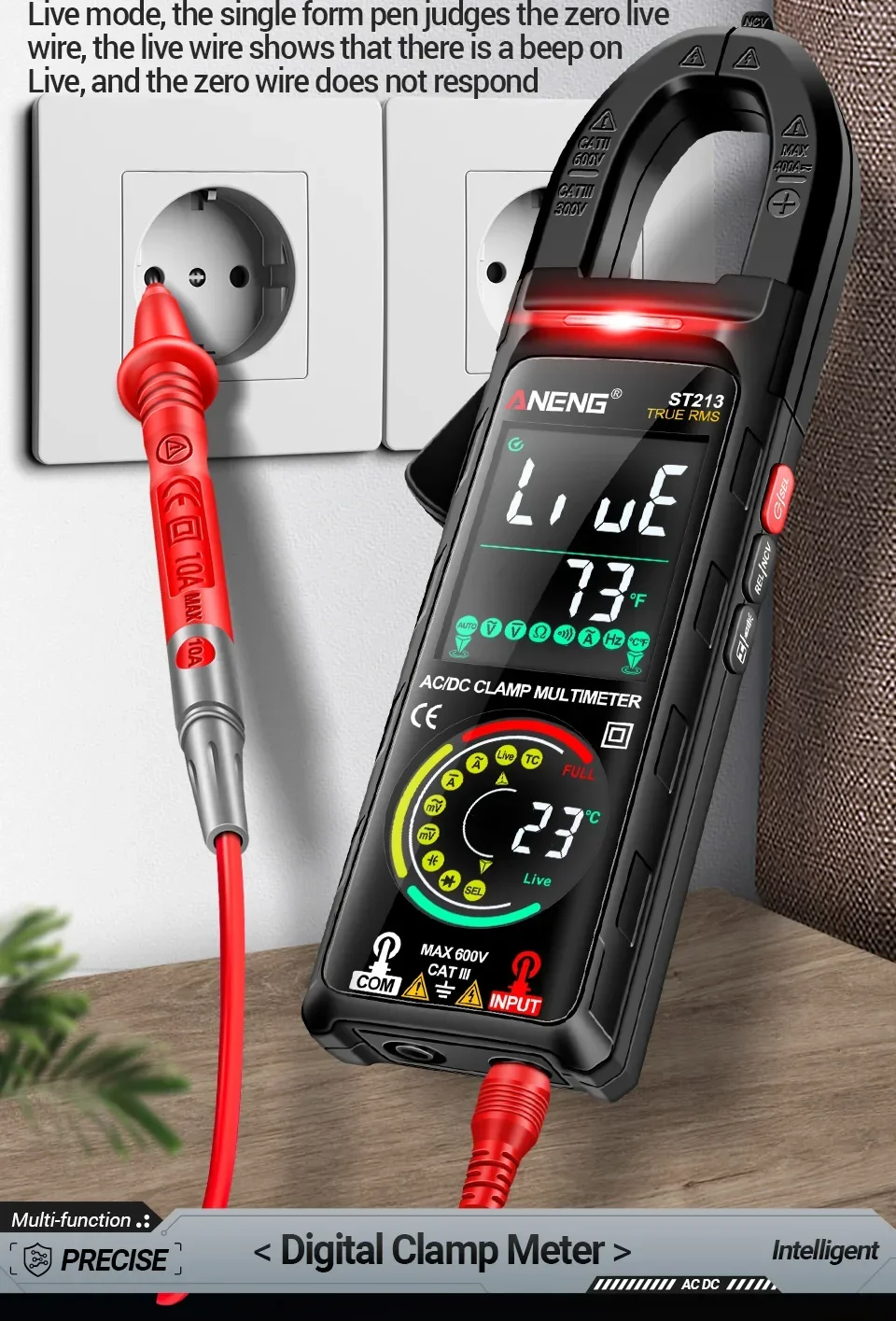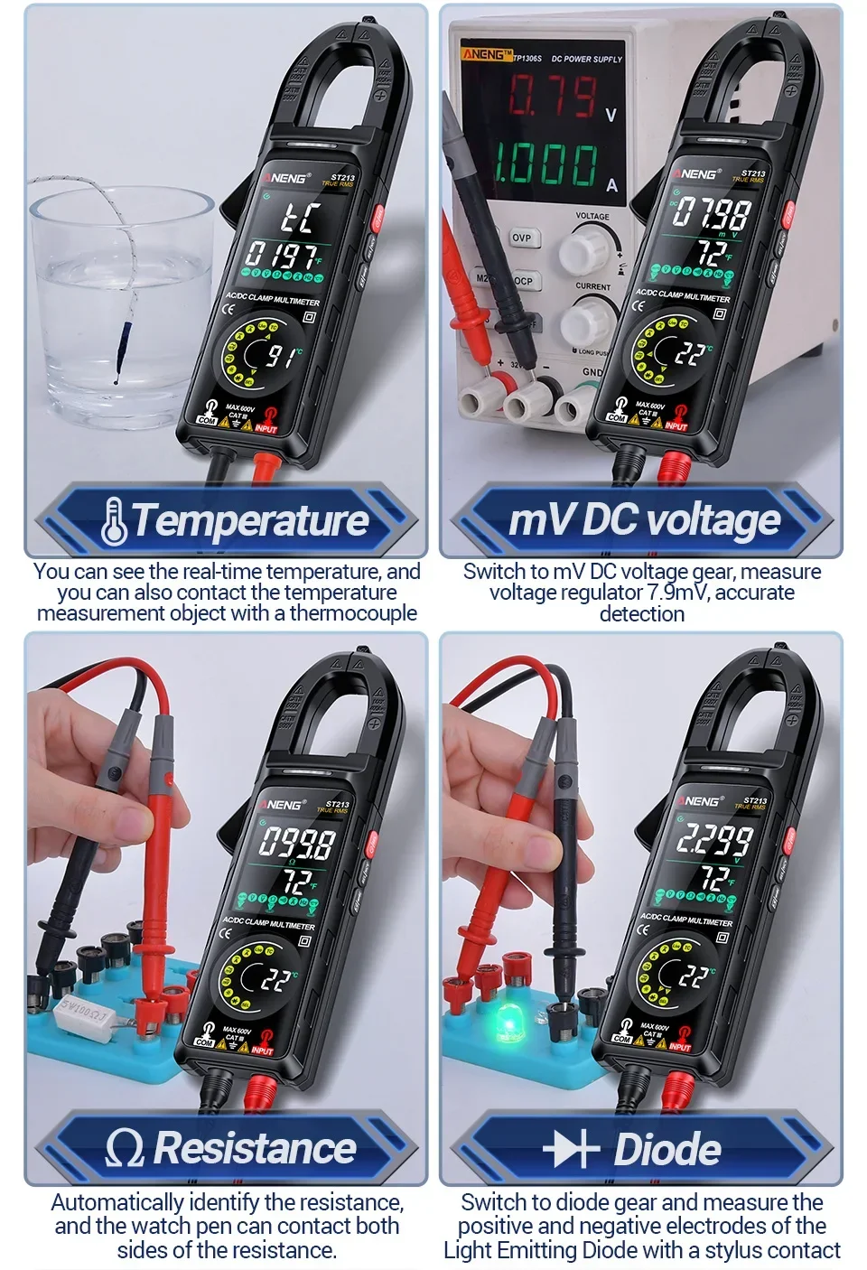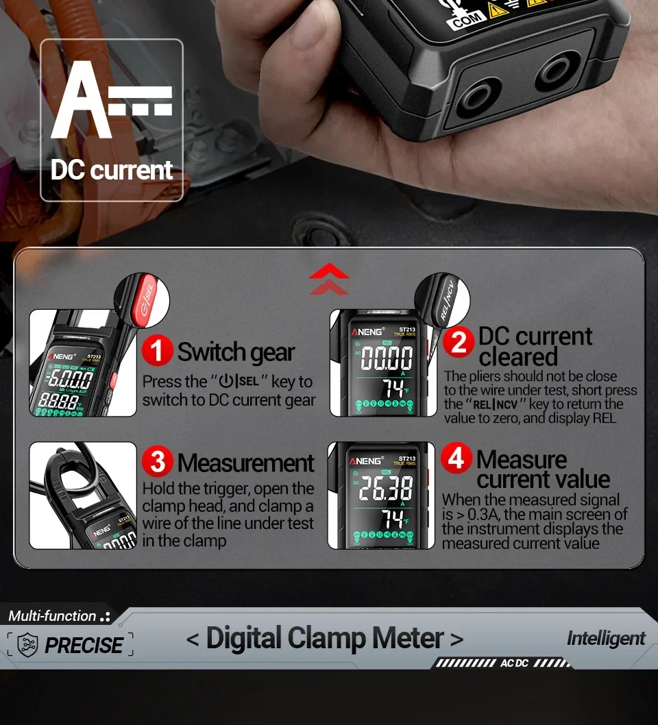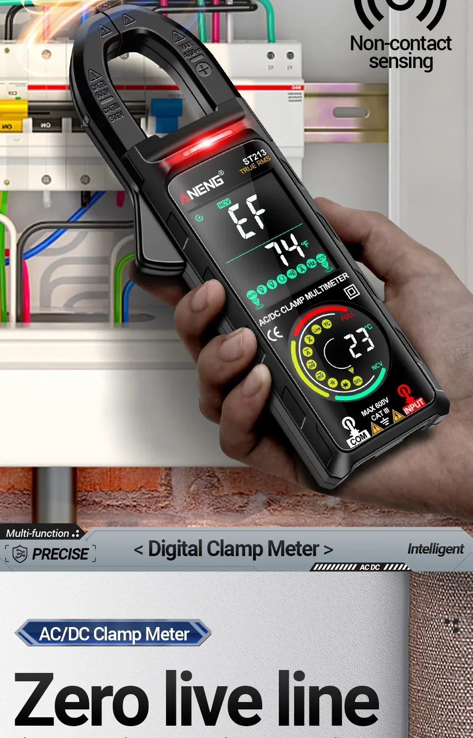 Aneng ST213 Smart Clamp Multimeter 6000 Count DC/AC Voltage Current Resistance Capacitance Hz Temperature NCV Buzzer Test