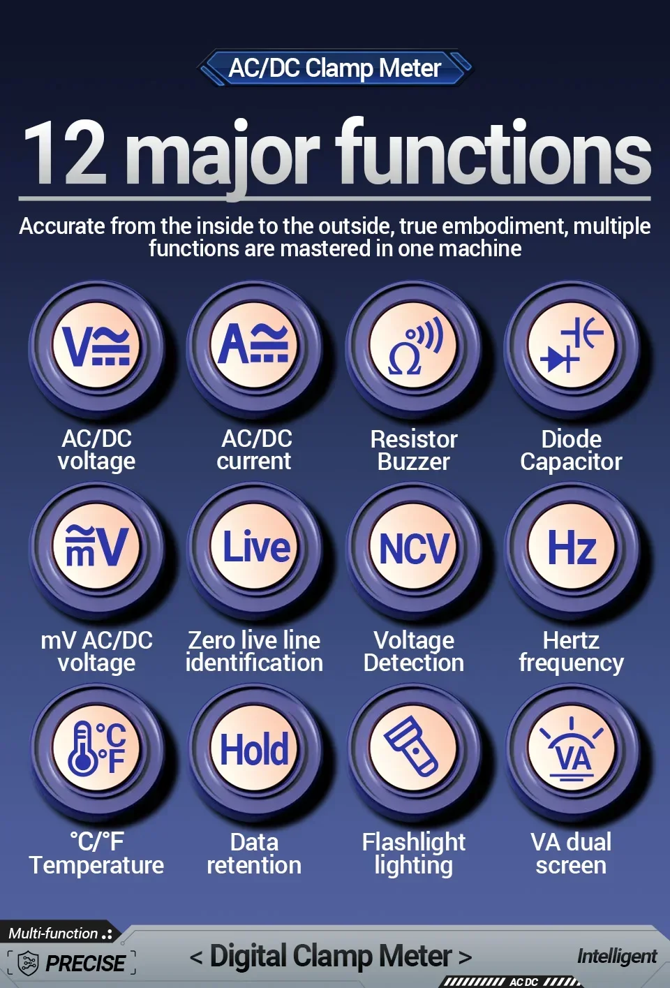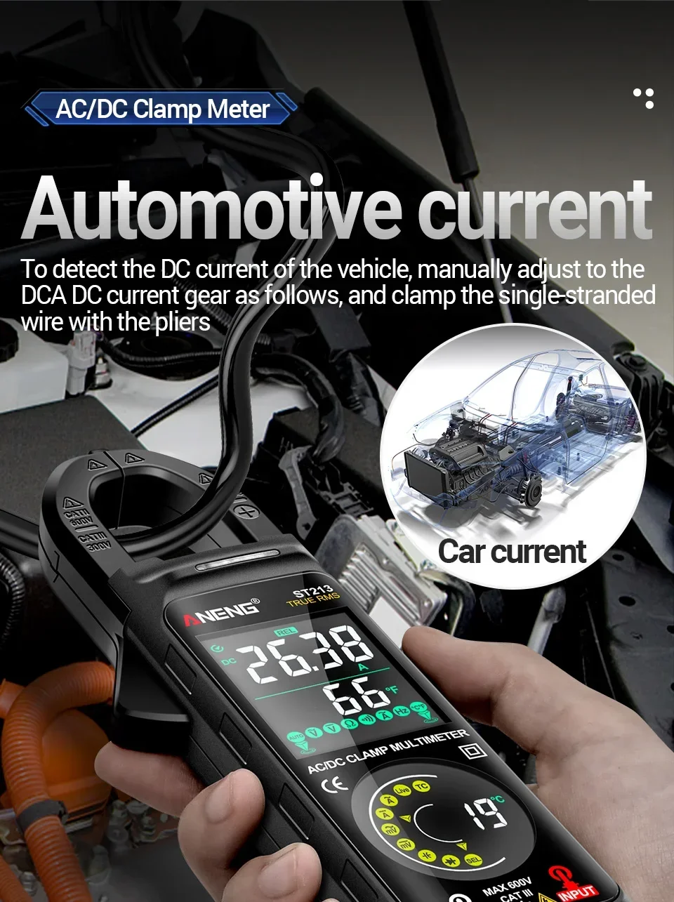 - Measures AC/DC voltage (up to 600V) and AC current (up to 600A)