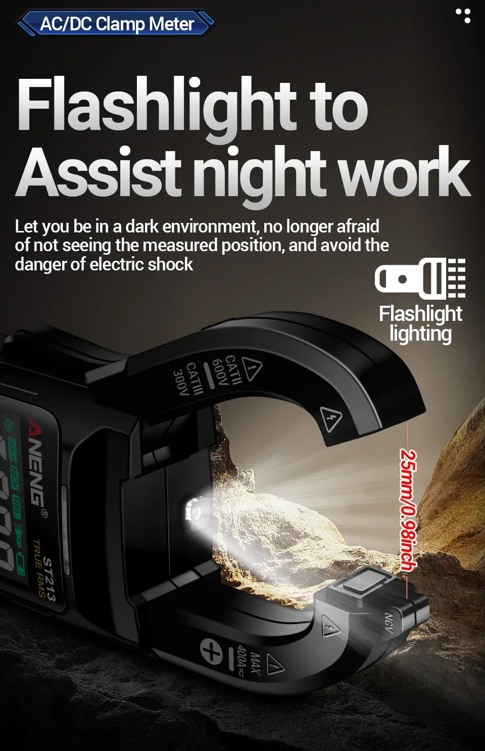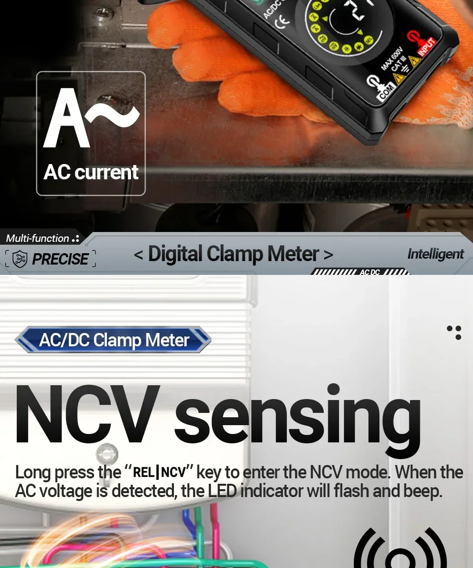 - NCV (Non-Contact Voltage) detection with visual and audible alerts
