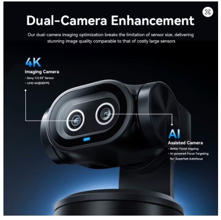 The EMEET PIXY uses a dual-camera design to deliver smarter tracking and improved subject detection. One camera is dedicated to high-resolution 4K video output, while the second camera supports AI tracking and motion recognition for more accurate, responsive framing. This combination helps the camera maintain smooth tracking even when you move quickly, turn sideways, or shift positions across the room.