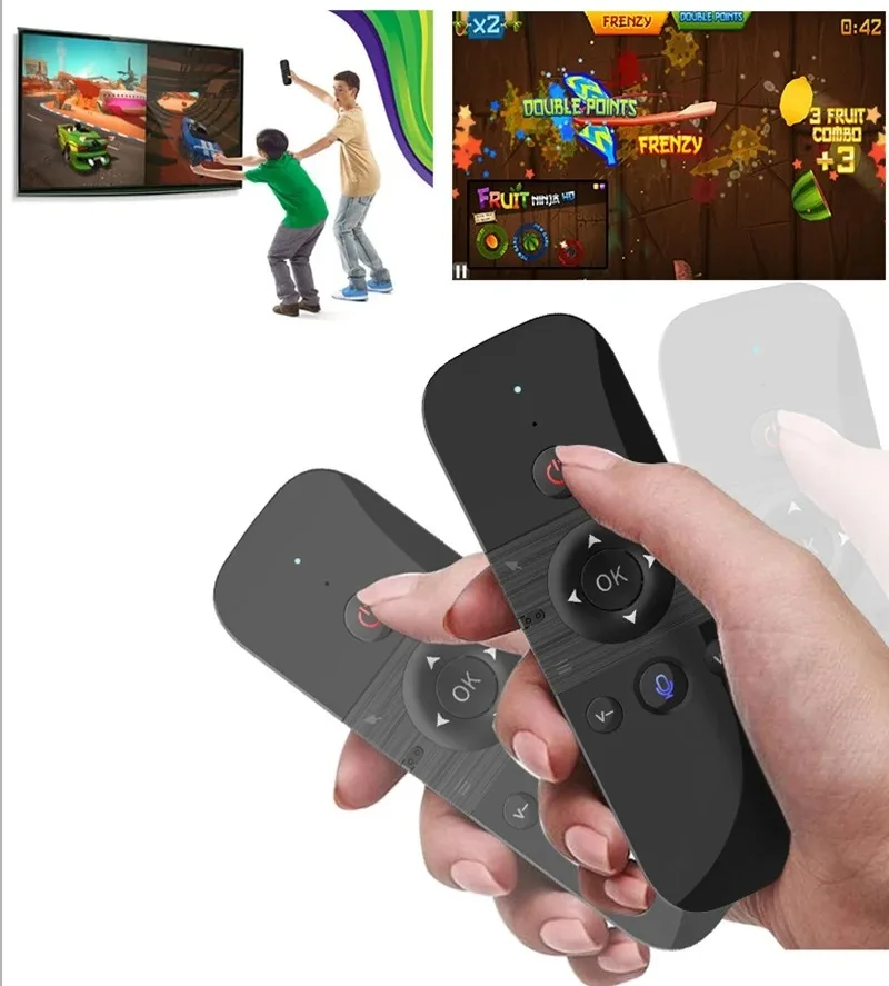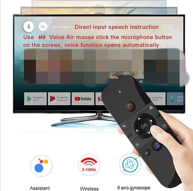 Featuring dual-mode connectivity (2.4G wireless and Bluetooth), the M8 ensures fast and stable connections across a variety of devices. Its ergonomic design fits naturally in your hand, while the air mouse functionality allows smooth cursor movement with simple gestures. The built-in voice control lets you search and operate your devices hands-free for ultimate convenience.