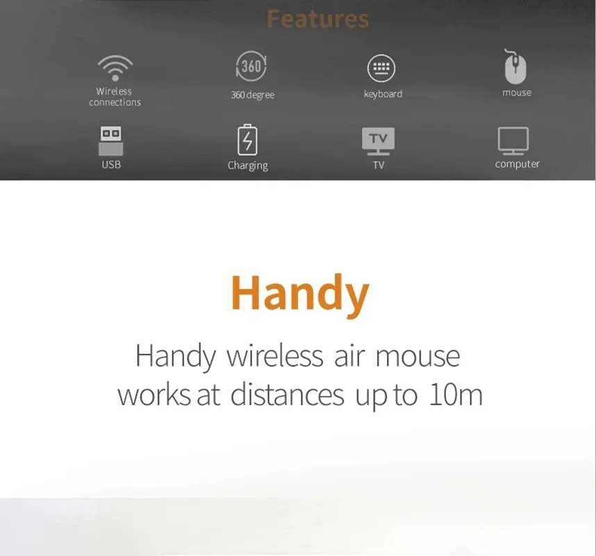 4. Low battery prompt:Â When the air mouse is running low, the LED light flashes slowly to remind that it needs to be charged; The LED red light is always on during charging; When the LED red light is off, it is fully charged.