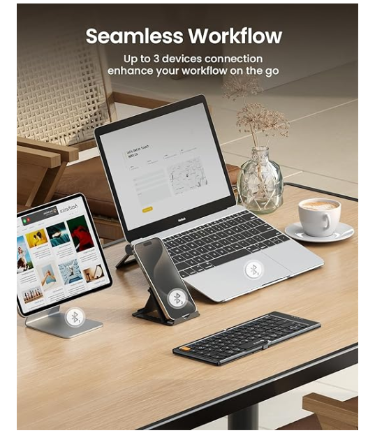 Sync Up to 3 Devices: Connect the keyboard with up to three devices simultaneously, allowing you to effortlessly switch between your smartphone, tablet, and laptop with the touch of a button. It’s a game-changer for multitasking and staying productive across multiple devices.