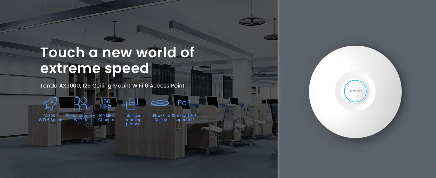 Designed for modern homes, offices, shops, schools, hotels, and cafes, the Tenda I29 supports PoE+ power, allowing easy installation using a single Ethernet cable for both power and internet—perfect for clean, professional setups.