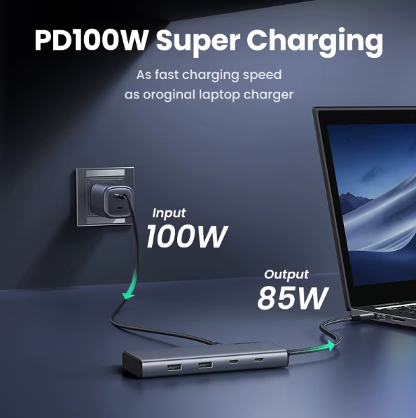 With blazing-fast 10Gbps data transfer speeds via USB 3.2 ports, transferring large files, videos, and documents is quick and efficient. The integrated 100W Power Delivery (PD) port ensures your laptop stays charged while in use, eliminating the need for multiple adapters.